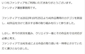 また、同社はこのたびFANBOX(ファンボックス)についても、当面のあいだ、AIの禁止を発表しています。