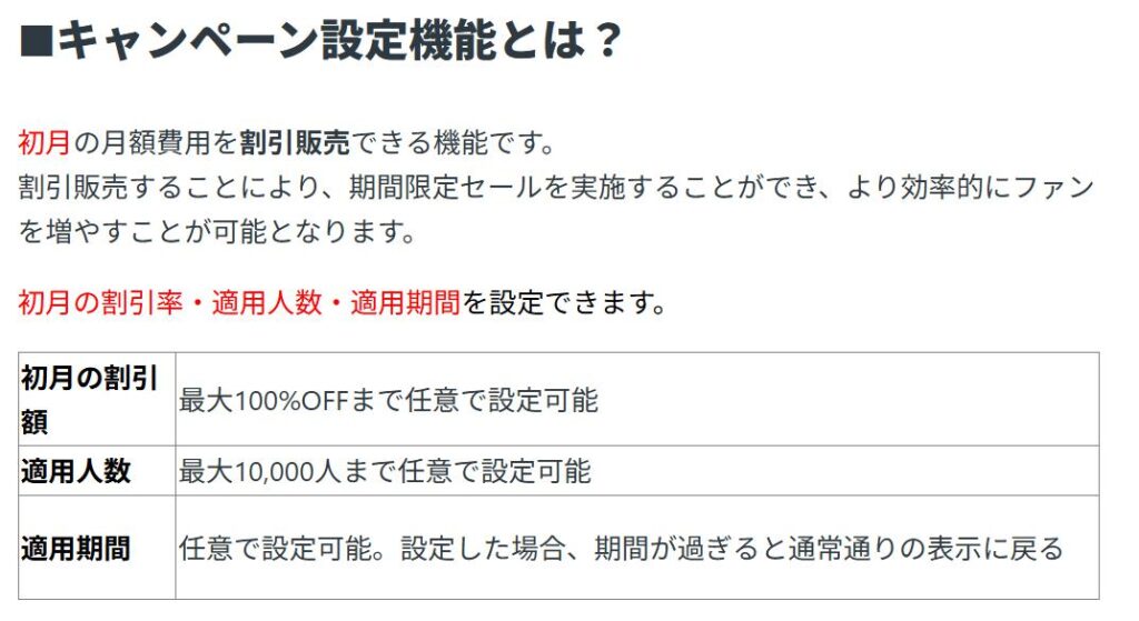 myfans(マイファンズ)では、初月の月額費用を割引し販売できるキャンペーン設定機能が提供されています。