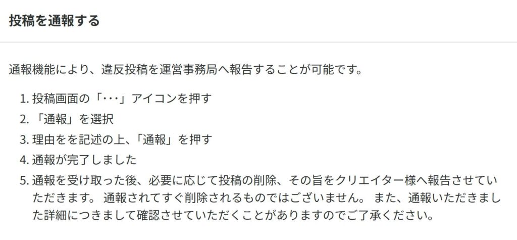 運営局が通報を受け取り、必要だと判断すれば、投稿の削除を行います。