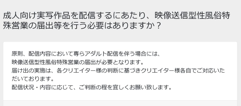 原則、配信内容において専らアダルト配信を伴う場合には、映像送信型性風俗特殊営業の届出が必要となります。届け出の実施は、それぞれクリエイターの判断に基づきクリエイター各自で対応していただいています。配信状況・内容に応じて、判断の程をよろしくお願いします。