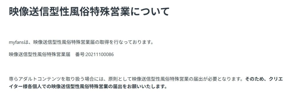 myfans(マイファンズ)の公式ホームページを確認したところ、2024年7月5日、myfans(マイファンズ)運営業者は、今まではそれぞれ投稿者の判断という形に留めていたのですが、それぞれの投稿者に対して届け出を求めるとし、ほぼ映像送信型性風俗特殊営業の届け出を行うことを義務化しています。